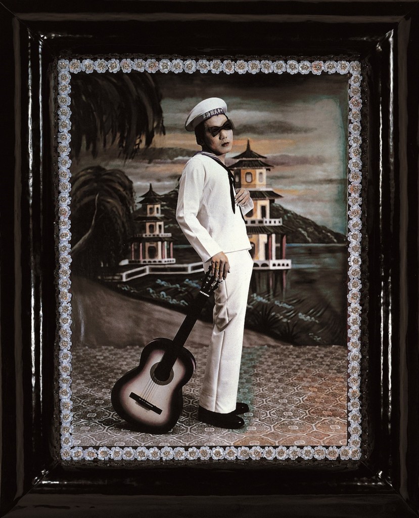 梅丁衍冷峻而憤世嫉俗的藝術語彙無法顯露的另一面,是長期以來臺灣主體性遭到否認的認同創傷。小梅丁衍兩歲的吳天章(1956-)或許是因為生長於面向海洋的基隆港,對於臺灣文化裡因政權更迭所造成的「表裡不一」,或是倪再沁所指的「借屍還魂」特質,有著敏銳的神經感應。基隆因其關鍵位置,見證了臺灣近現代歷史上各時期或大或小的戰爭與衝突下,在此橫死的歷史冤魂:歐洲海上霸權的爭奪、族群衝突的漳泉械鬥、日本皇軍的登陸、二二八事件的殺戮……,使得這多雨的海港顯得既新潮國際化,卻又抑鬱沉重。在《再會吧!春秋閣》中【圖3】,人造漆皮水手服、攝影棚裡偽造左營春秋閣戶外景色的帷幕、應該「雄赳赳氣昂昂」卻陰柔曖昧的海軍,在在都透露著聚光燈所照亮的人物是一個俗豔卻虛假的空殼,甚至四邊精心鑲上的人造花、塑膠亮珠與假鑽都像是裝飾遺照的邊框,暗示著影中人的缺席。種種元素的配置營造出一種不自然與不安感,呈現的是被抽空的主體。