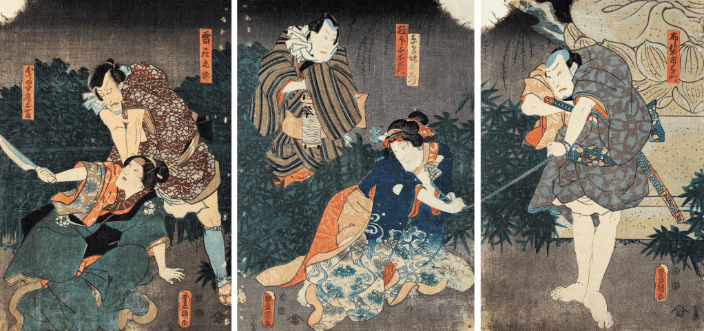 在役者繪的多聯作作品中,三聯作《隅田川花御所染》【圖8】是其中較為特別的一件,該幅作品是三代豊國投入英一蝶門人之門下學習後習得的畫風。三代豊國於1820年代開始傾慕英一蝶(1652-1724)那種可以不經深思便快筆捕捉到人物神韻的形式,遂加入其門下學習,並在1820至30年代頻繁使用「香蝶樓」或「五渡亭國貞」的畫號進行創作,以示對英一蝶的尊重。[4] 畫作描繪的是屬於「お家物」的其中三個場景,物太、お初、軍助三人在同處的夜晚所表演的默劇:右幅的物太嘴咬一卷奪得而來的信物;中幅的お初正細讀著手上草屐尾部的遺囑並面露驚訝;左幅的軍助右手扶著刀把,一臉義憤填膺,為其日後殺死物太為主報仇一事埋下伏筆。相比其它多聯作作品精細的背景描繪以及具互動性的人物表現,該幅作品的背景以留白為主,突出畫作中演員各自的特色,人物之間雖看起來較無互動感,但其實豊國巧妙地運用了道具和禽鳥在其間飄逸的流動感,串聯出三人間的互動,極具特色。