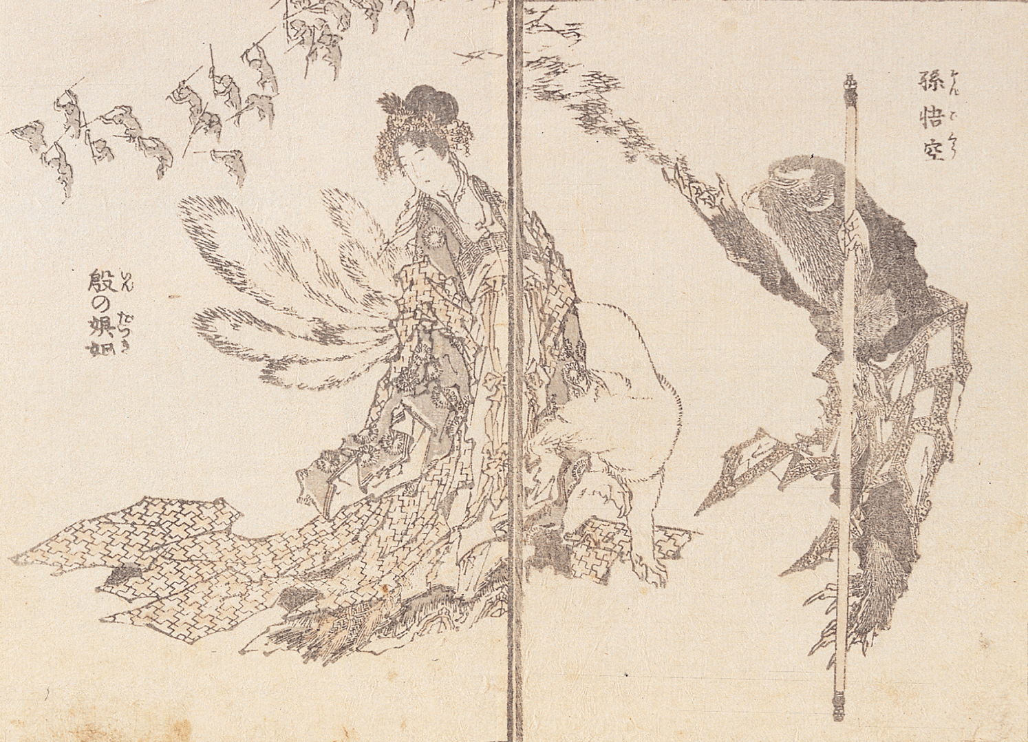 本次「版印浮生」展出的作品,出自《北齋漫畫》第十篇,由廣告頁可知此篇的精彩要點為「描繪神佛、高僧幻術及風雅人物等」,[13] 例如:皆擅法術的「孫悟空與殷妲己」【圖6】,前者手拿金箍棒欲施其術,後者則化身為九尾狐慫恿君王;或是《水滸傳》經典人物的描繪【圖7】,又或是擁有各式異能、異象的人,如吞刀、隱形,長頭、牛舌等【圖1】。第十篇的內容可說由神異現象到鬼怪皆涵納其中。藉由本次展出的《北齋漫畫 第十編》,提供了觀者一探北齋眼中豐富且充滿趣味的生活型態。