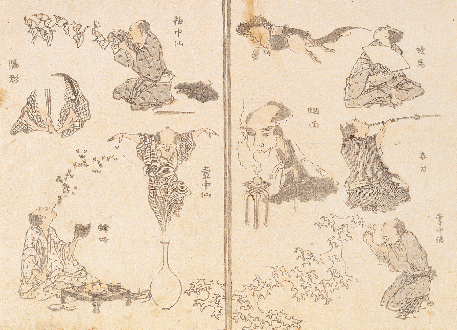 《北齋漫畫》共十五篇,收錄近四千張圖版,題材包羅萬象,囊括了人物、動物、自然、建築、傳說故事、神異景象【圖1】等,可說是集結了北齋一生的見識與思想。宛如百科全書般的創作,亦帶有教學性質與通俗性,受用了當時想習畫的莘莘學子。[1] 系列初篇出版於1814年,二、三篇於1815年,四、五篇於1816年,六、七篇於1817年,八篇於1818年,九、十篇於1819年。第十篇的最終圖片本已宣告此系列的完結,但因居高不下的人氣,使得北齋繼續繪製創作。直至1849年北齋逝世前,又刊行了十一至十三篇(1849年,秋),最終十五篇於1878年刊行。[2] 長達六十四年的暢銷書,影響甚是深遠,且透過收藏與傳播在歐洲興起了風潮,如十九世紀印象派畫家馬內(Édouard Manet, 1832-1883)[3] 、竇加(Edgar Degas, 1834-1917)[4] 的畫作中可見其形體的參照、轉譯或臨摹。