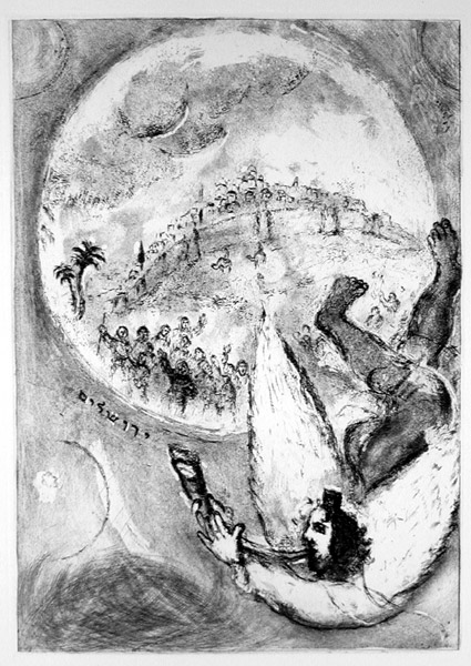 這樣的融合特性也延續在他的插畫中。以佛拉的聖經版本為例:首先,藝術家確立了插畫中猶太信仰的基調,例如他選擇的插圖主題集中在猶太先祖、君王及祭司等文化代表人物上,並且經常在畫面中穿插猶太象徵物和希伯來字母。另一方面,他也融入了猶太文化以外的影響,不僅在舊約場景中加入新約的解讀,更結合了自身背景、現實政治動盪與當代思潮等,作出屬於藝術家的個人詮釋。最直接的例子,就是當夏卡爾於二戰後歷劫歸來,繼續他未完成的聖經插圖工作時,作品卻風格丕變,不再是描繪有清楚文本對照的聖經場景,而是多次呈現隱晦的先知預言,指涉著戰後以色列建國的意象【圖3】。畫家現實生活中所經歷的衝擊,於是轉譯為畫面中對聖經文本的個人思索。