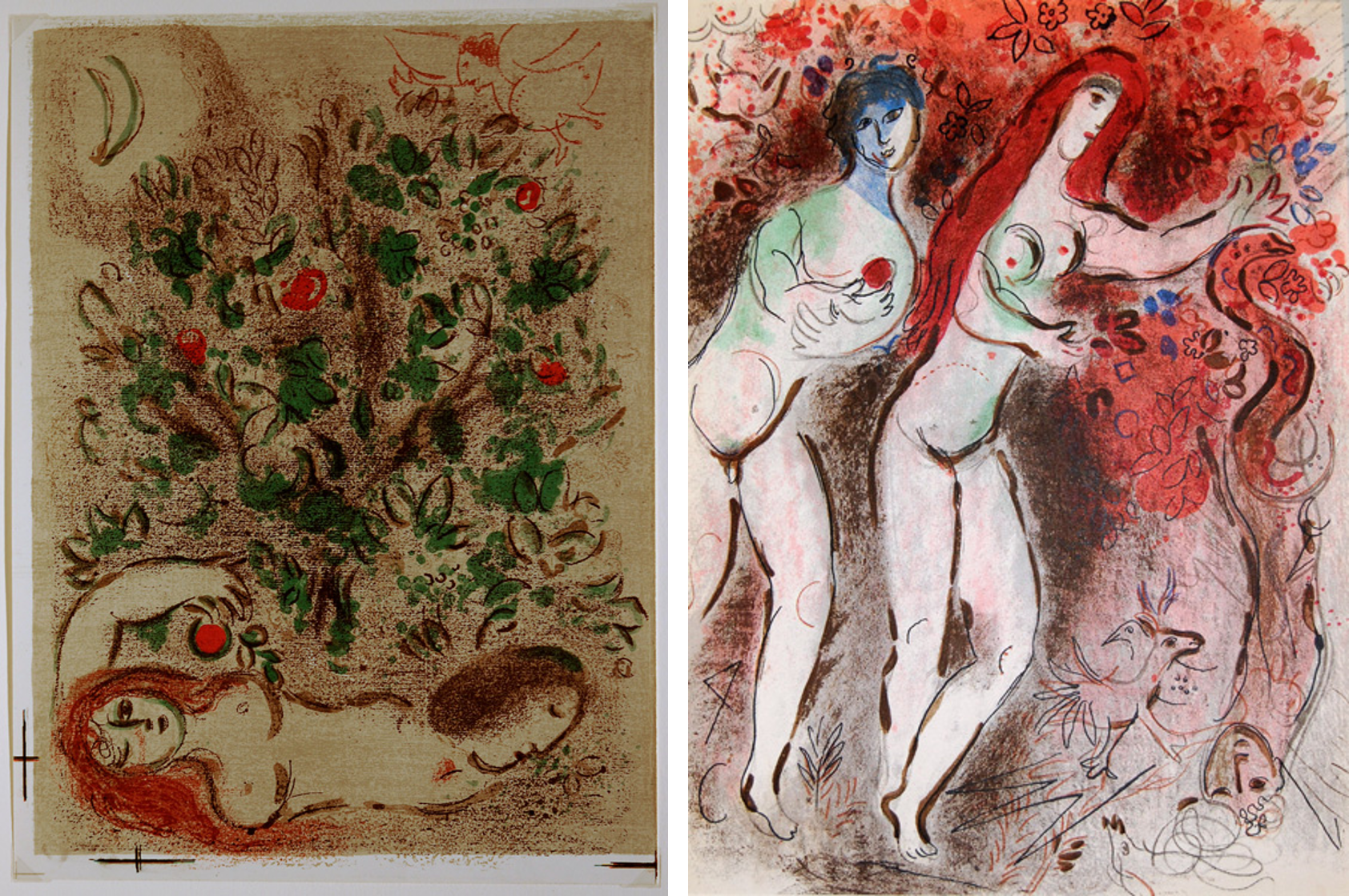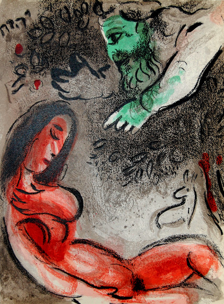 最明顯的證據,就在其中插畫對象的選擇。夏卡爾一反先前聖經插圖版本中所選擇的猶太男性先祖,這回出現的角色,幾乎全是舊約中屈指可數的女性。他不僅挑選出聖經中少數以女性為主角的章節,甚至在以男性為主的篇章中,也選擇將焦點放在文本中草草帶過的女性配角身上,並且經常給予她們獨特的觀察視角。除此之外,在彩色石版印刷有限的色彩中,畫家用來作為全系列主調的,便是經常與女性形象連結的紅色;在不同圖版中,紅色發揮著不同的象徵作用,令人聯想到愛、熱情或慾望。
