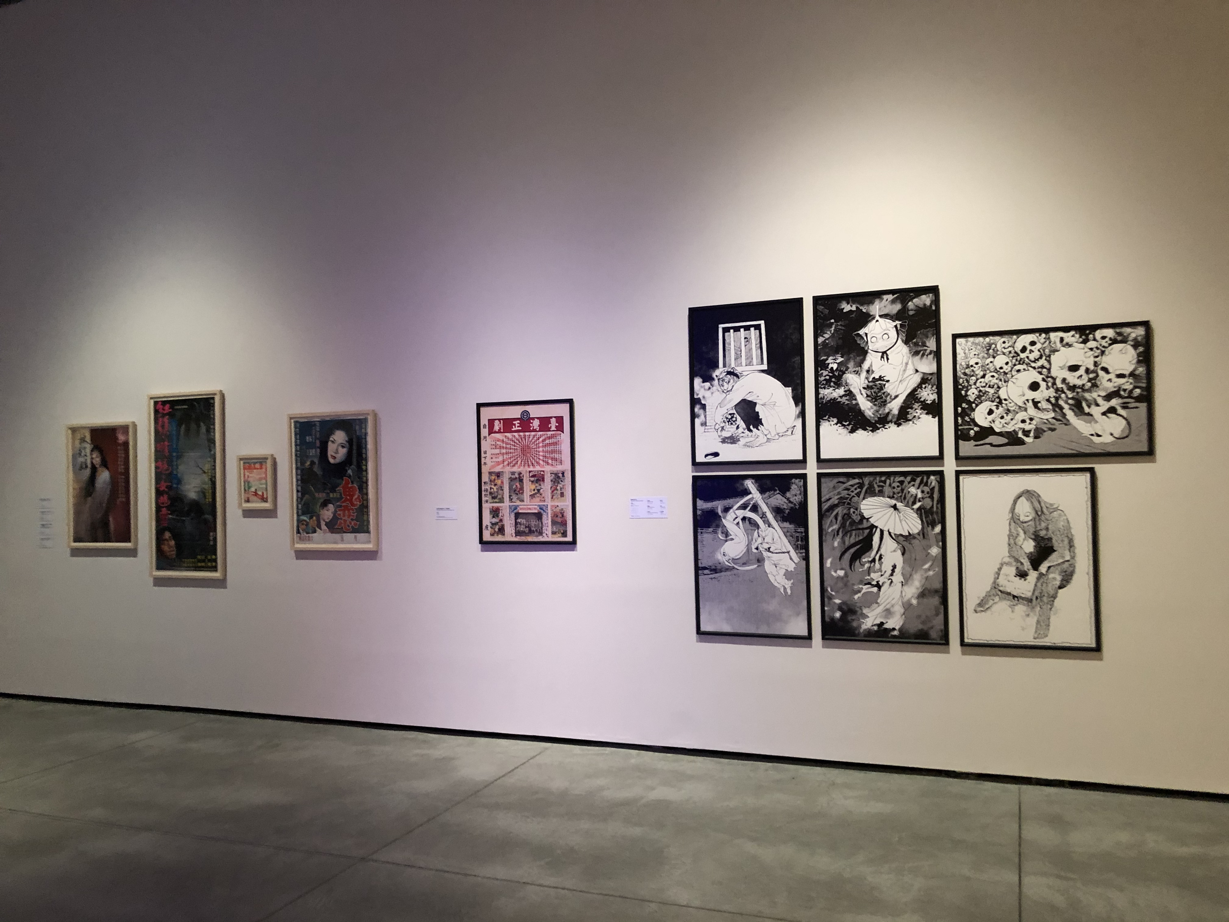 台灣也有自己本土的妖魔鬼怪!不只在視覺藝術或實體裝置上,電影及表演藝術皆可見台灣鬼魅文化。這次特地從台灣歷史博物館借出早期白衣女鬼形象的陳子福手繪海報原版,同時也聯繫了台灣許多的電影製片公司,授權展示較為著名的《紅衣小女孩》(2015)、《粽邪1》(2018)、《粽邪2》(2020)等海報。這些電影公司很多已經改名或是不復存在,取得聯繫十分困難,因此也借助了宣傳行銷的媒體或民間戲院協助尋找原版海報。為了呈現更多台灣在地面貌,展覽挑選的電影作品皆有深意,如《紅衣小女孩》最早源自1998年一段民眾提供給靈異節目的影片:在台中市大坑的山上,拍到一位身穿紅色洋裝、面目蒼老卻是孩童外型的女孩,令人不寒而慄,後續參與此次郊遊的人隨即病死,對於影片與故事的爭議眾說紛紜。另外,彰化鹿港沿海一帶的傳統民俗送煞儀式「送肉粽」,就是《粽邪》取材的原型,而《粽邪》也是籌備過程中第一個取得聯繫的電影,華影國際影藝公司熱情地提供有簽名的原版海報。