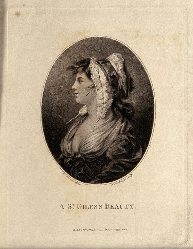 版畫的標題是「聖詹姆士美女」(A St. James’s Beauty)與「聖吉爾斯美女」(A St. Giles’s Beauty),橢圓畫框中的兩位美女頭像都以側面表現,各自看向左右,形成對看成雙的方式,應該是為了並列展示的肖像作品。「聖詹姆士美女」頭戴有羽毛與緞帶的帽子,前額有珍珠頭飾,頸部有蝴蝶結裝飾,是位精心裝扮的時尚女性;「聖吉爾斯美女」則頭戴蕾絲便帽,帽緣下方的帶子散置於頸部,前額劉海隨風飛揚,看來隨性自然。查詢各大博物館與拍賣會網站,這兩張點刻版畫有黑色、紅色、褐色墨水印製的幾種版本,還有加上手繪的彩色版,強調出點刻版畫特有的裝飾特色。