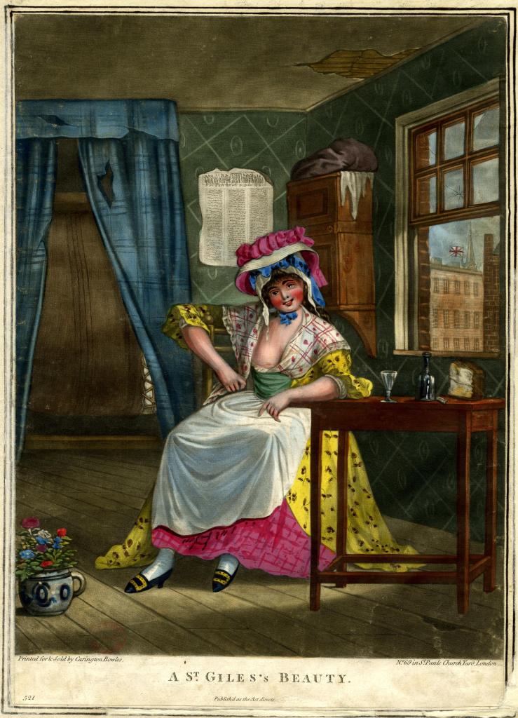 這是前述兩張點刻版畫出版隔年的1784,一位倫敦市中心聖保羅地區的風俗版畫出版商鮑爾斯(Carington Bowles, 1724-1793)所出版同樣題目的彩色與黑白美柔汀(mezzotint)版畫,畫中兩位女子的穿著與頭飾明顯是仿照1783年的點刻版畫,只是原本古典文雅的風格,登時變成粗俗諷刺的意味。半露酥胸的「聖吉爾斯美女」,從桌上的酒杯、地上的花盆和身後半開的床簾看來,顯然意指從事色情行業的風塵女子,從破碎的床簾、天花板、窗戶玻璃看,她所在的房間像是個破落戶,牆上貼的印刷報紙(broadsheet),上面更有印了絞刑圖的公告,表示這是犯罪率高的地區;而「聖詹姆士美女」雖衣著整齊,姿態優雅,背景的屋內陳設也算有書卷氣,但從女子手執象徵愛情的玫瑰、俗艷的胭脂妝容與整體色彩看來,應該也是暗指高級妓女或王室情婦之類。[5]從刻版的技巧看,這兩張美柔汀版無疑是粗糙的便宜貨,畫上也沒有設計與刻版者的名字,表示屬於次級品。鮑爾斯出版的流行版畫,代表了18世紀晚期倫敦都會的商業取向,內容與風格大抵都屬諷刺、黑色幽默、時尚流行、風俗色情等主題。[6]