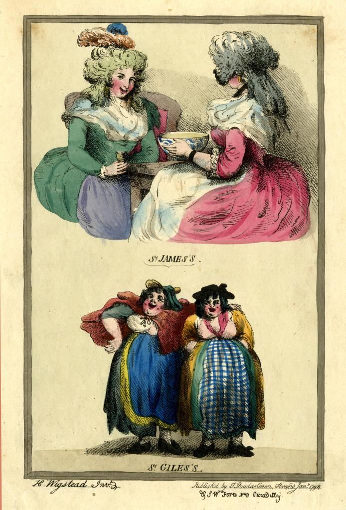 上方題為「聖詹姆士區」兩位頭戴假髮、穿著時髦的貴婦,對坐在桌旁,一位頭頂飾有羽毛、手執酒杯、面露討好的笑容,另一位捧著大酒碗(punch-bowl),準備斟酒;「聖吉爾斯區」則是兩位衣著粗陋的胖婦女,搭肩站在一起,正面對著觀者,似乎是在街上招攬客人。漫畫用意顯然是在諷刺賣笑行業,不管是上流或中下階級社會都是一樣不堪。從時代與社會思考,這個時期的英國人在對岸法國大革命的風潮影響下,似乎也對階級與社會問題著墨良多。