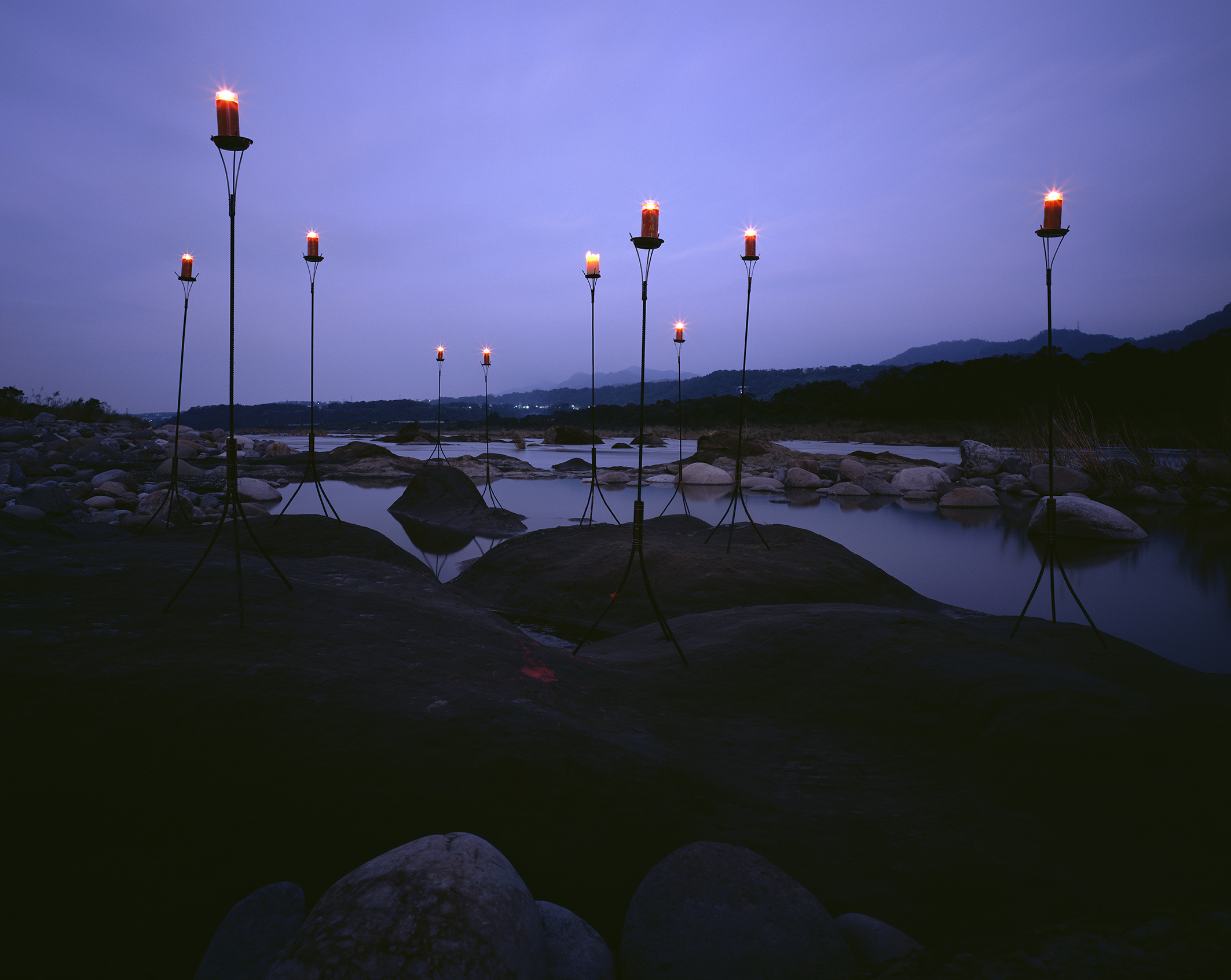 葉偉立不僅在攝影中強調葉世強的手工藝和簡樸作風,也運用物件裝置照亮家屋的靈性,感通前人的創作精神。在《十燭台,龍潭三坑溪》,葉偉立仿照複製燭台造型10座,排列矗立在晚霞下的河邊,向葉世強敬虔祝禱。夜晚降臨的時分,燃燭的儀式帶動感官和心緒的引渡,從黑暗見到光芒,象徵時間流淌和身心狀態的變化。燭台的製作意味著技藝的傳承,可見兩個時代下的工匠,堅持用低科技自製生活和儀式用具,形成互為主體(intersubjective)的對話關係。