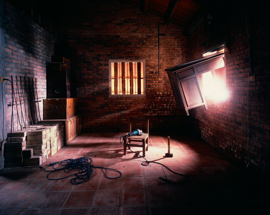 葉偉立扮演中介者,為不同的人和物搭建橋樑。他試圖將外公的桌子遷入葉世強故居,一度因為體積過大,必須拆除窗欄才可搬進房內。有幾幅照片呈現桌子抬進屋內之前之後的變化,其中一幅《鐵鎚》可見強烈光束下破窗而入的桌子,離奇懸空,處在岌岌可危的微妙平衡點。在畫面中心的椅子上置放著電鑽和鐵鎚,代表整修房屋的操作工具。來源不同的舊物皆失去了主人,彼此並置和產生關聯,有如歷經漫長冬眠之後再度逢春新生。