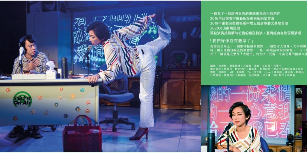 就一個表演藝術團隊來說,如果可以為這個建築物來量身打造一個劇本的話,應該是我唯一能做的事情,所以我選擇在裡面做創作。可是直接寫市場的話,我覺得沒有意義,要了解市場直接去跟攤商聊天就好了,不需要我多寫一個故事去複誦。所以我就想要把這個故事情節擴大,我聯想到地下賣藥電臺的那種老歌賣藥。整件事就連結了起來,所以《宇宙之聲》本來就是一個議題先行的劇本。