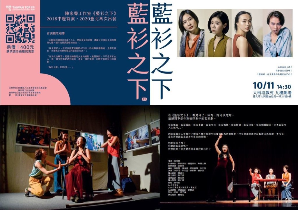 《藍衫之下》原本是視覺藝術創作,藝術家歐陽文慧追溯客家血緣,在線上發起了一個尋找客家妹的活動:去對方家裡,用秘密交換秘密的方式,來交換對於客家的認同,以及一些從小到大的成長、生活,以及和家人會遇到的一些事情。對一個表演藝術者來說,我覺得它故事性很強,想著:「如果把這個東西做成戲劇版會長怎樣?」於是開啟了《藍衫之下》這個計畫。