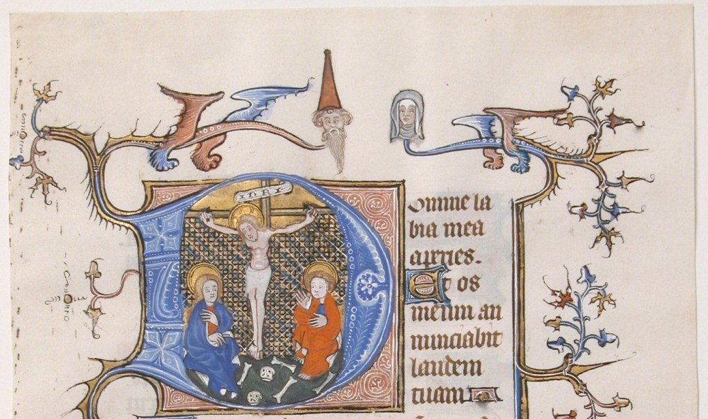 除了一般圖畫外,文字外圍的花邊裝飾也很常見於泥金裝飾手抄本中。這些屬於外框的裝飾被稱作marginalia,這些邊框裝飾通常也是手抄本中最有趣的。比如大都會美術館所藏的《修道院啟示錄》中【圖4】,藝術家使用紅色與藍色的線條畫了一對龍鳳;而在另一本時辰祈禱書的散頁中【圖5】,莊嚴的耶穌受難像上方的外框尾端,藝術家加上了兩顆人頭,使得整幅畫面看來十分的滑稽。