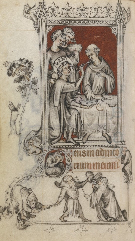 除了上述的章節外,時辰祈禱書也經常收錄福音書節錄、十字架的時辰祈禱、聖靈的時辰祈禱、詩篇節選等,另外,時辰祈禱書也會特別收錄訂做聖人個人相關的禱詞。比方《法國王后埃弗勒的珍娜時辰祈禱書》中,特別收錄了聖路易的時辰祈禱,聖路易(也就是法國國王路易九世)是法國的主保聖人(patron saint)之一,他被稱作聖王,不僅是因為他曾經參與十字軍東征過,回國後路易九世濟貧拔苦,是為法國皇室的典範,在這個章節中的圖像多為聖路易的慈善事蹟,比方聖路易親手餵食痲瘋病人的圖像【圖5】,這也是鼓勵王后能夠多參與這樣的慈善活動。