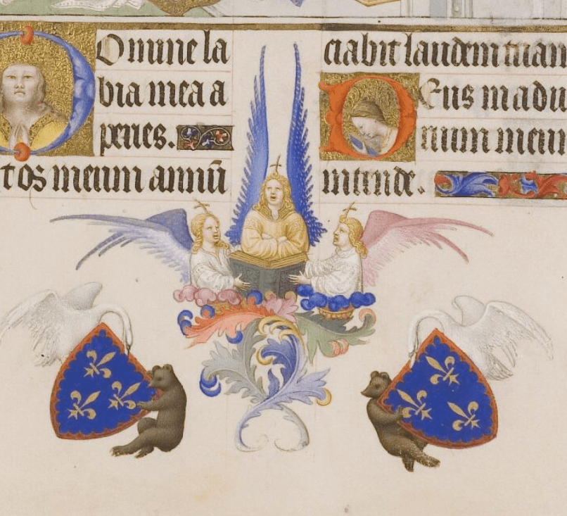除此之外,這樣個人化的書籍也少不了到處註記自己身分的圖像,比方在之前提到的《里公爵的美好時辰祈禱書》的一月中【圖1】,右方穿著藍色衣裳、頭戴毛皮帽的就是貝理公爵。而在聖母的時辰祈禱開頭頁的下方【圖6】,出現了藍底金色百合與天鵝和熊的組合個人的紋章,這樣的圖像也一再告訴我們:時辰祈禱書是極度個人化的藝術作品。