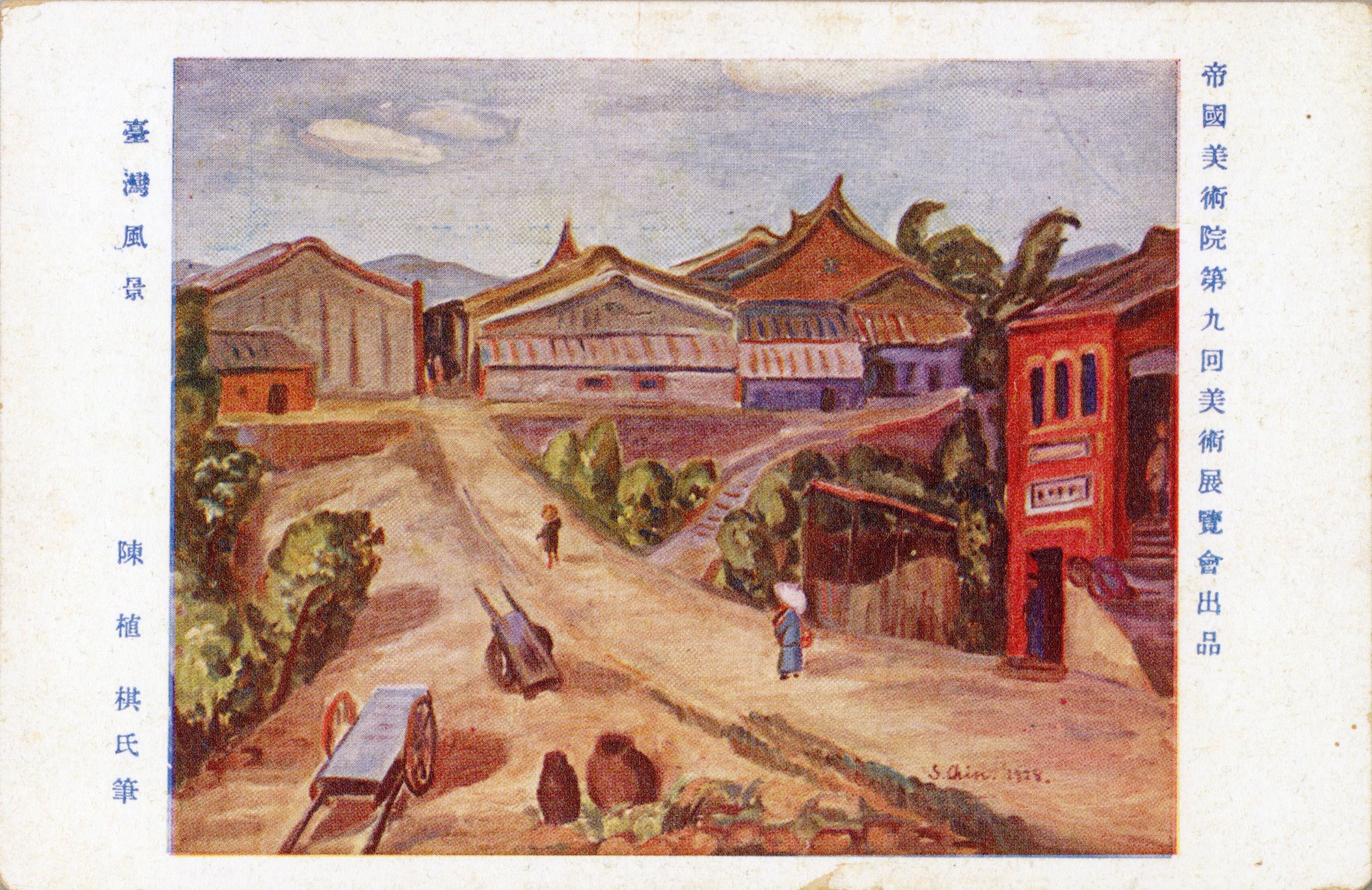 《臺灣風景》色彩鮮明,將景物星羅棋布,畫家像是悠悠念出一首描述故鄉的臺灣民謠。庄腳路,大板車,紅磚仔厝前,身影沓沓仔行。作品首次入選帝展後,陳植棋興奮地寄出家書,每句都如同是寫給自己的期許: