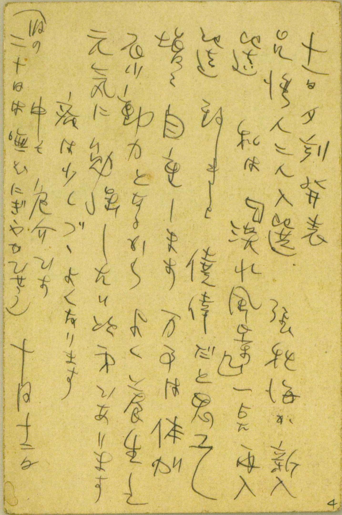 比起長篇的家書,明信片紙幅有限,卻仍透露畫家的無比喜悅。他此處的筆跡特別活潑,有的畫圈,有的拉長弧線,有的輕快挑起,轉落下一筆,有點親切有點可愛。不難想像書寫者的興奮之情,像是溜冰選手在場上迴旋飛舞後的痕跡。不過,陳植棋也因趕赴報名帝展,奔波中染病導致肋膜炎,所以提到養病一事。紙短情長,喜憂總是參半。