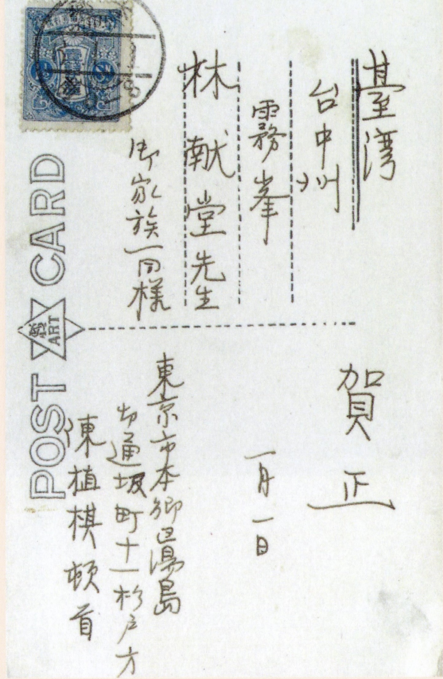 從前引的書信內容、生平經歷,和親友的描述中,可知陳植棋其實是位熱血青年,滿懷對家人、美術創作,與臺灣民族的熱情,一如他振筆疾書的筆跡。然而,在這張明信片上,除了兩字賀詞外,再無隻字片語。