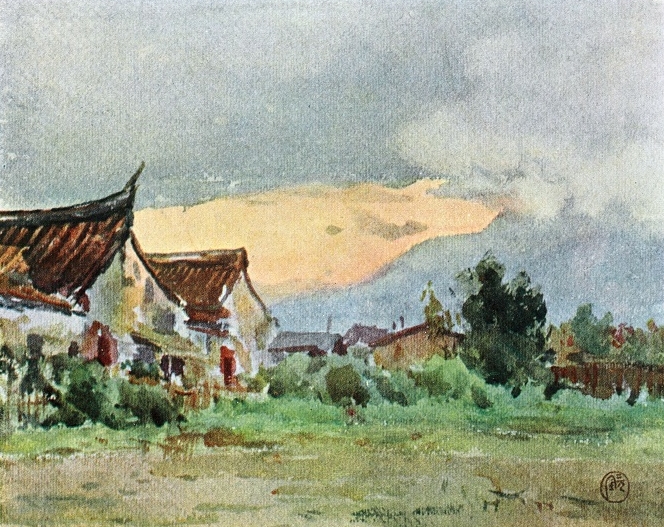 石川欽一郎在1907年首次來臺,他一方面任職陸軍部,時常隨同部隊深入山地,描繪深山風景與理蕃過程的圖像;另一方面,他同時兼任總督府中學校(今建中)與總督府國語學校(今臺北教育大學)的老師。這段時期,石川時常遊走在臺北的巷弄與田埂間,四處探索寫生作畫的題材。有時,他會將畫作寄回日本,刊印在他和畫友共同經營的水彩畫雜誌《みづゑ》(水繪)上,向日本讀者分享臺灣的風景。1908年10月,《みづゑ》42號刊登石川的水彩畫《古廟》,使用接近原色的印刷方式,將石川輕盈迅捷的畫風如實呈現在雜誌上。
