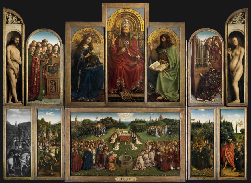 在黑克特.費里奇阿諾(Hector Feliciano)的《失落的美術館:納粹竊取最偉大藝術作品的陰謀》(The Lost Museum: The Nazi Conspiracy to Steal the World’s Greatest Works of Art)中,作者舉的第一個例子便是現在已經回到羅浮宮,由維梅爾(Jan Vermeer, 1632-1675)繪製的《天文學家》(The Astronomer)【圖二】。在希特勒眼中,維梅爾這樣代表了泛德國民族驕傲的畫家便是頂級的必收目標之一,其他納粹眼中重要的藝術家包含了出身北方的林布蘭(Rembrandt van Rijn, 1606-1669)以及范艾克(Jan van Eyck, c.1390-1441)。其中范艾克的《根特祭壇畫》(Ghent Altarpiece)【圖三】就曾差點落入納粹手中,因為教堂人員知道德國人遲早會入侵他們的城市,因此特別將這件巨大的作品運往梵諦岡,途中卻聽說義大利加入了軸心國的行列,於是作品只好待在法國並不幸被納粹找到,但因為同盟國持續的空襲,這件祭壇畫被放在一座礦坑裡躲避猛烈的炮火,而在二戰後這件作品也回到了比利時的根特。