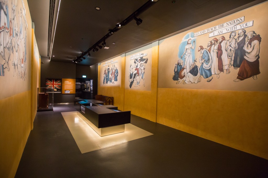 另設置全新的沉浸式裝置、模擬重建的牢房空間【圖9】,和提供戰俘精神慰藉的聖經故事複製壁畫【圖10】等,展現戰俘從被拘禁的日常,到面臨苦難的挑戰,再到最終的解放,希望觀眾能以身歷其境的體驗,感受日佔時期樟宜戰俘和平民被拘留者的故事與經歷,從各種充滿勇氣和堅韌的故事,記住普世人性散發的光輝。