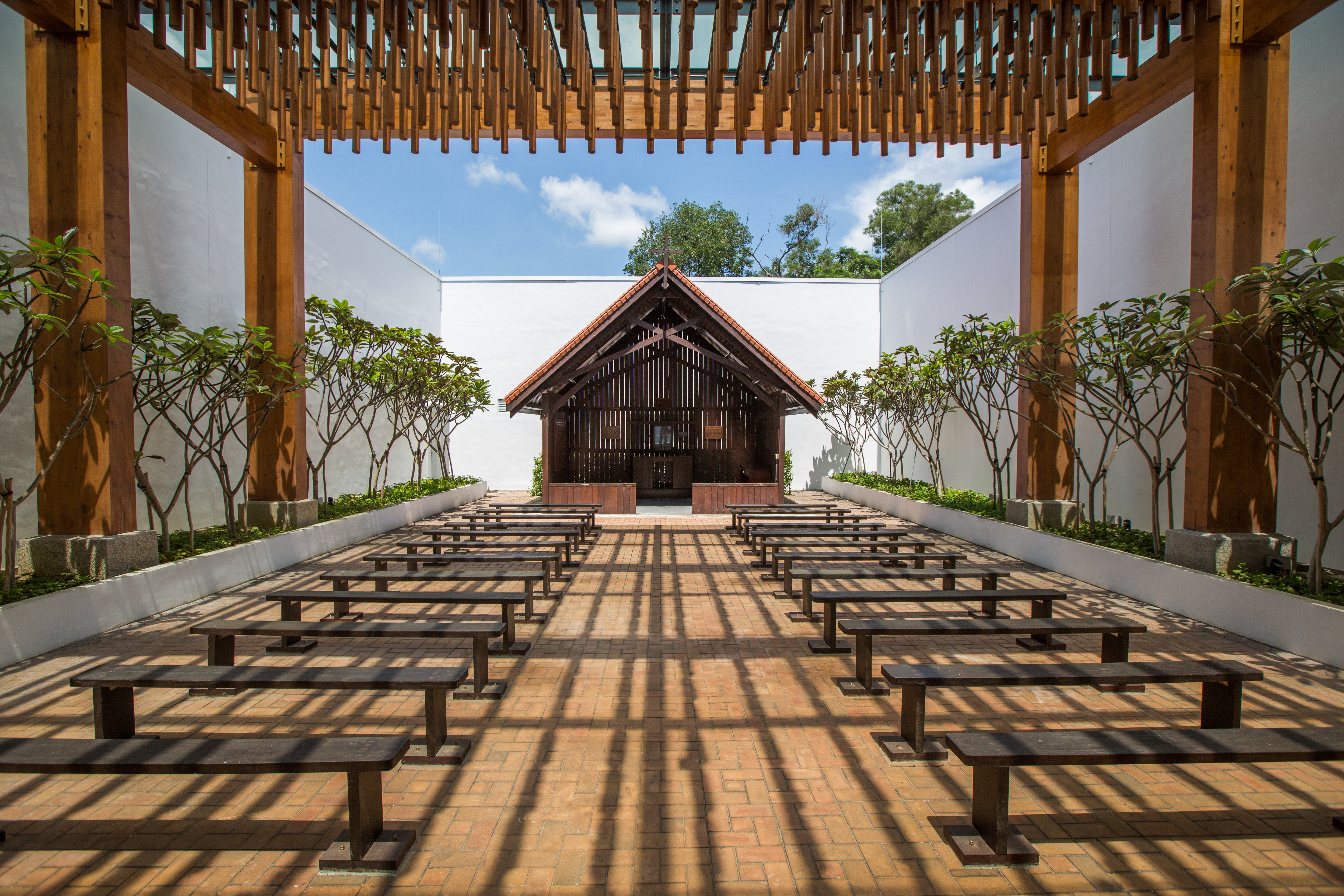 戰後,樟宜地區的戰俘營逐漸被全數拆除,除樟宜監獄被保留下來,直到今日仍為新加坡政府所用。因著國際旅遊的興盛,許多過往曾被關押於此地的戰俘和其家屬陸續前來追思弔念,隨著前來參觀的人數越來越多,為避免觀光需求影響監獄維安等因素,新加坡政府於1980年代末期,計畫在監獄旁重建二戰時期戰俘們於營區建立的小教堂,以供遊客追憶。伴隨自1990年代起有系統地規劃與二戰有關的歷史遺跡等文化政策,新加坡政府最終定案將樟宜紀念館蓋為一座以合院建築為主的場館,加上一旁重建的象徵性教堂【圖2】【圖3】,成為今日所見的樟宜禮拜堂與博物館。[3]