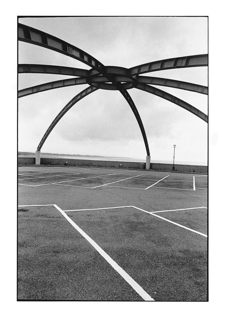「看海的日子」開頭有一張停車場的空景照,是永安漁港一個巨大的地景裝置,這個實際上頗庸俗的彩色景觀,在梁國龍的鏡頭下猶如一隻踏在白色方格上的黑色大蜘蛛,暗示了地方的改變與非自然的介入,拉開系列序幕。