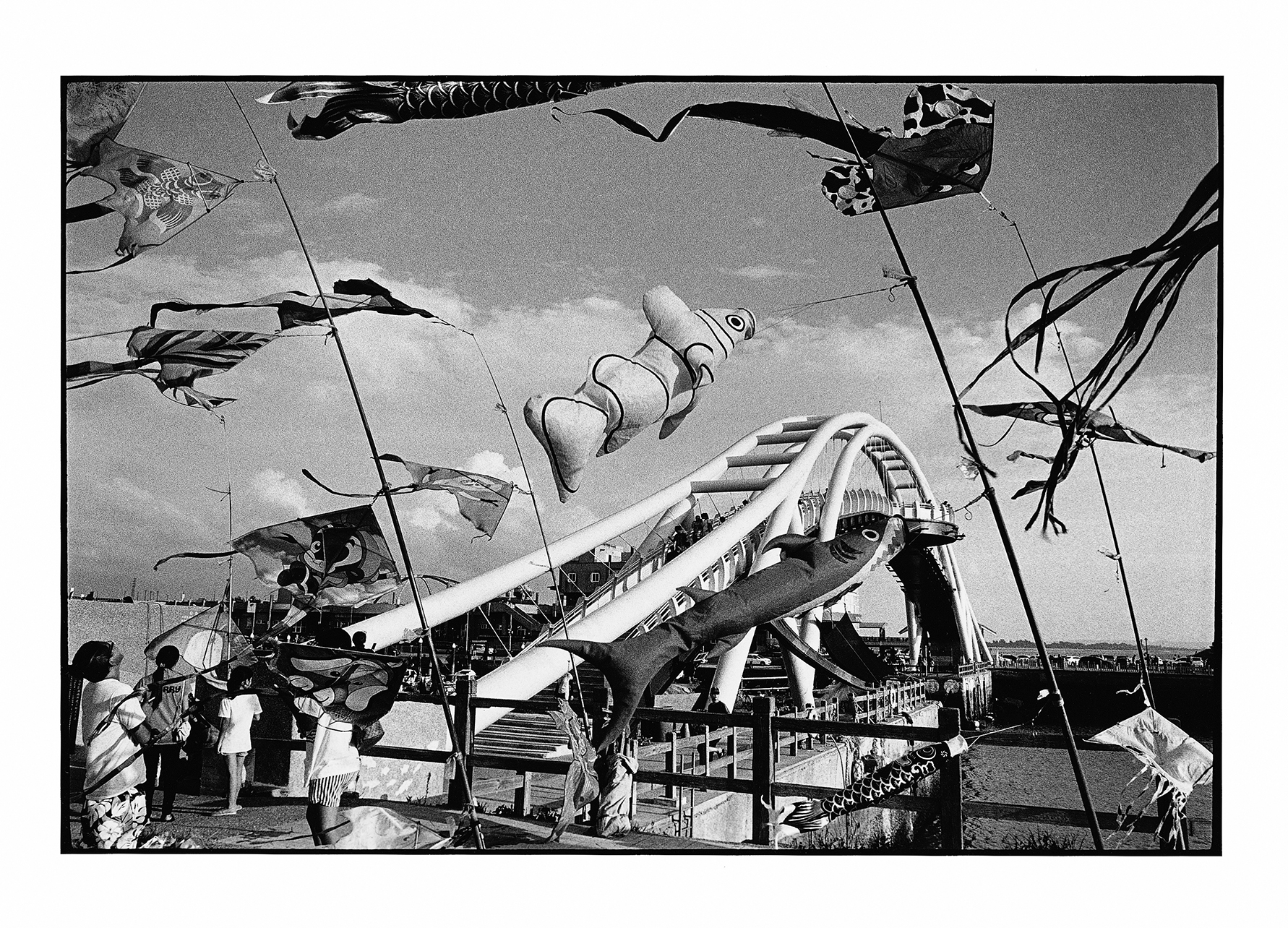 「看海的日子」開頭有一張停車場的空景照,是永安漁港一個巨大的地景裝置,這個實際上頗庸俗的彩色景觀,在梁國龍的鏡頭下猶如一隻踏在白色方格上的黑色大蜘蛛,暗示了地方的改變與非自然的介入,拉開系列序幕。