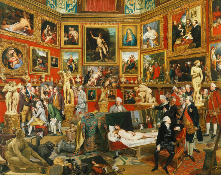 十九世紀上半葉之後,歐陸各國可謂是美術館/博物館遍地齊放,然而這也帶來了新的問題:觀眾。過去這些畫作的擺放方式以及整個展廳的呈現,很大程度都受到收藏者個人的品味與愛好所影響。然而,當進到公共博物館/美術館的場域時,這樣的運作方式便不再有效,特別是這些機構還肩負著提供公眾教育的責任,如何讓觀者可以有效地去親近、理解以及欣賞這些作品,及其背後的歷史、文化脈絡,就變得至關重要。從圖像上我們可以見到,過去在王宮貴族的宅邸,以及學院沙龍展中的展示傳統,是會將整個空間的牆面,由上而下掛滿大大小小的畫作【圖六】。這些早期的藝術收藏家,在陳列畫作時所依照的準則,並非是歷史性(historical),他們所強調的是繪畫的「風格(style)」。早期的藝術理論將線性(drawing)、色彩(colour)、構圖(composition)與表現(expression)視為繪畫的四大構成,透過展品的並置陳列,使觀者可以比較分析不同派別的特質,其最終的目的在於提供更佳的藝術風格認知。如此的展示方式,是十分要求觀者的知識背景與藝術鑑賞能力,對於藝術史的建構與公眾展示而言,是十分不利的。到了十七世紀初期,義大利的藝術藏家同時也是醫師的朱利奧・曼奇尼(Giulio Mancini, 1559-1630),在其論著中將藝術鑑賞定義為「辨認繪畫媒材、年代、作者、出處及優缺的能力」,曼奇尼的定義打破了過去風格至上的鑑賞方式,為藝術史論述與展示引進一套具科學邏輯的分類方式。十八世紀初期林奈(Carolus Linnaeus, 1707–1778)在《自然系統(Systema Naturæ, 1735)》一書中所提出的生物分類法 [5],也更進一步地影響藝術品的陳列方式。在整個十八世紀可以看到有越來越多的王公貴族或是藏家,將自身的收藏與宅邸中的藝廊重新進行擺設,如:德國收藏家蘭柏特・克拉赫(Lambert Krahe, 1712-1790)便將位於杜塞道夫的Electoral Gallery中的藏品,依畫家與年代整理陳列。