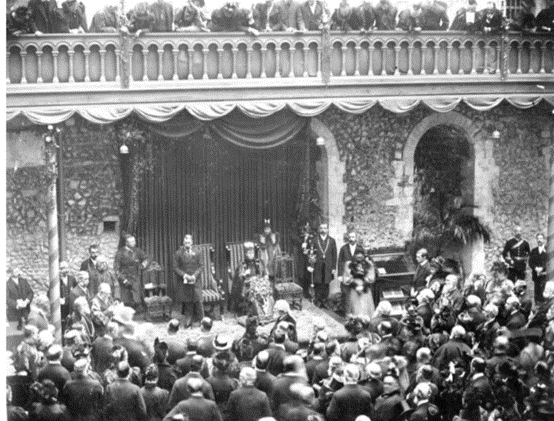 柏曼評估了城堡內部可用的空間,並做了一系列的空間規劃,並在1888年時提交了博物館改建計畫及空間重建的草圖。有了前述哥尼所捐贈5,000磅的博物館創建資金,又有了柏曼提出的館內空間規劃,在1894年間,諾里奇城堡陸續進行了整頓翻修的工程,並開展了擴建計畫。在整建之初,柏曼發現該館的現存空間無法進行擴建,因此城堡內主要廳房僅能用於保存與展示人類學與考古學上的物件,而地理學、礦物學、生物學、動物學……等物件和哥尼收藏的猛禽標本、以及藝術作品,則分別保存並展示在該城堡其他的側翼空間與廊廳內。總體來看,諾里奇城堡這座原為監獄之所遂成為形塑地方文化,並展藏諾里奇地區藝術作品、考古發現、以及自然史標本的重要基地。哥尼和柏曼的博物館計畫最終迎來了成功的掌聲,並於1895年隨著博物館正式對外開放,開啟了文化遺跡轉型為地方公共博物館的里程碑。讓人覺得惋惜的是,城堡博物館對外開放前,哥尼就不幸離世,無法親自參與見證這座城堡博物館為民眾開放的盛況【圖3】。同年,刊登在《諾里奇城堡博物館插圖指南和紀念物》(Norwich Castle Museum Illustrated Guide and Souvenir)一冊中,揭示道:「諾里奇終於有一座博物館得以讓市民感到驕傲了!」而諾里奇城堡博物館的創生與當時英國的文化生態蓬勃發展有很大的關聯。[2]英國於1851年在倫敦海德公園(Hyde Park)的水晶宮(Crystal Palace)成功地舉辦萬國工業博覽會(Great Exhibition, London)後,延續該博覽會其茂盛蓬勃的文化產能,創生了1852年的工藝博物館(Museum of Manufactures),也就是現今維多利亞與阿爾伯特博物館的前身(Victoria and Albert Museum)。諾里奇城堡藝術博物館也就在當時博物館陸續設立的風氣中誕生,成為當時英國社會對於博物館成立的熱潮,以及公民對於博物館能帶來知識或藝術美感的文化需求程度的印證。