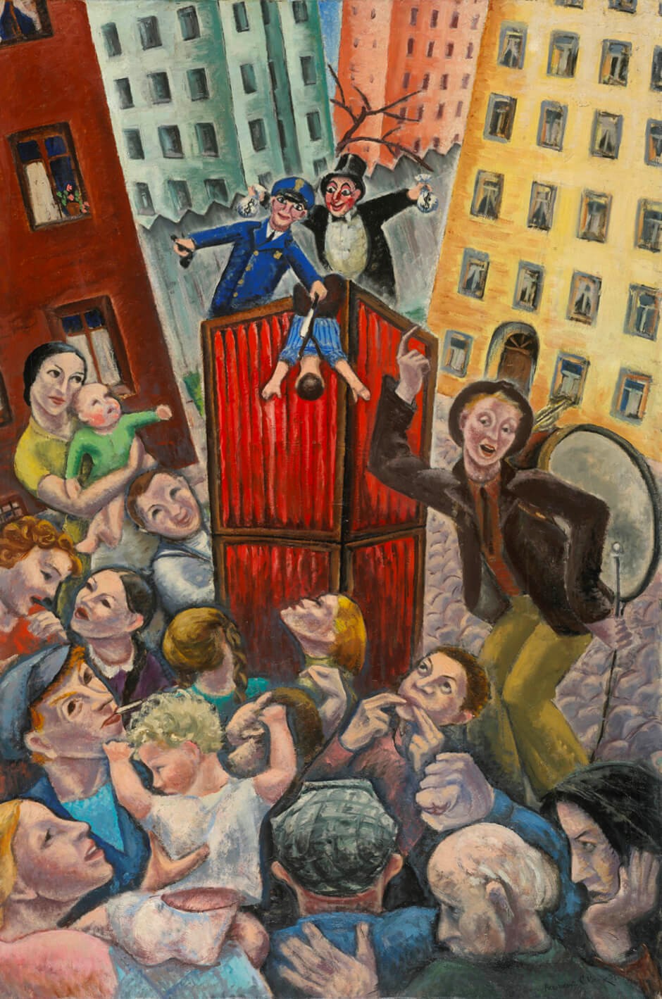 克拉克擁抱原生國家身份,承認歐洲文化遺產,專注於以反映社會為目的創作藝術。最著名的Petroushka (1937)[1]【圖4】是一幅強烈的社會控訴,卻巧妙揉合她在聖彼得堡的童年回憶和她對暴力衝突的回應。她改編了俄羅斯傳統木偶戲Petroushka(相當於義大利喜劇Commedia dell’arte Pulchinello)的故事,以描述工人的困境:被資本主義(銀行家)迫害,執行者(警察)也為利益屈服。而觀眾會站在公寓樓之間的鵝卵石院子裡俯視著場景,人群用貓叫和握緊拳頭來回應表演——這是反法西斯力量團結和抵抗的象徵,在這裡用來表示藝術家對他們事業的支援。