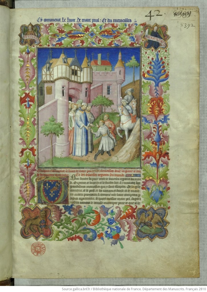 何謂「巧思」呢?這包含許多面向,舉例而言,勃根地公爵無畏的約翰(John the Fearless, 1371-1419)曾在1413年的新年時送了自己的叔叔貝里公爵約翰一本泥金裝飾手抄本,其中收錄許多旅遊文學類型的文字配以精美的繪畫,其中最著名的莫過於馬可.波羅的遊記(也稱為〈奇蹟之書〉);無畏的約翰曾參加過惡名昭彰的十字軍東征,雖然他在1396年時被鄂圖曼帝國俘虜,但最後奇蹟似地回到法國,因此手抄本內對東方世界的描寫也就很大程度地是在指涉送禮者,同時書中無處不是貝里公爵的纹章,這樣的禮物不僅是為貝里公爵量身打造的,書中內容也會讓收禮者一再的想起送禮者。【圖一】