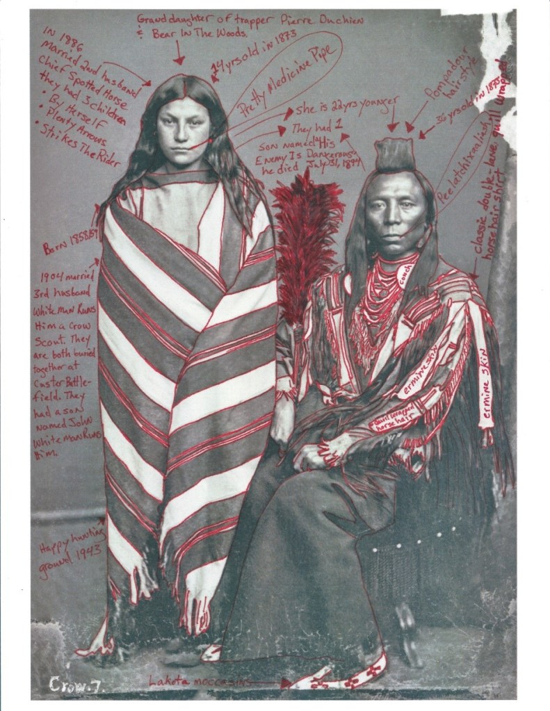 瑞史達在〈老克羅與妻子優美醫藥煙斗肖像〉記錄了1858/59年出生當時年僅約十四歲的優美醫藥煙斗與大她廿二歲丈夫老克羅的合照,畫面上方註記優美醫藥煙斗祖父的名字重申系譜,畫面左邊記錄了優美醫藥煙斗之後1886年第二段婚姻和1904年第三段婚姻的相關細節和小孩姓名,畫面右邊註記老克羅的髮髻式樣與服飾的細部描述。而兩人間的雞毛撣子則是相傳代表團造訪華府時曾觀賞歌舞秀,隨後歌舞團贈送每人一支雞毛撣子道具以茲紀念,瑞史達提到當代表團回到蒙大拿保留區時雞毛撣子甚至成為風尚,許多年輕的部落首領紛紛仿效,成為當時的趣談。然而,瑞史達提到美國政府接待克羅代表團的相關趣聞某種程度則轉移了焦點,因為當時美國政府計劃在蒙大拿興建鐵路,而鐵路開發橫跨克羅原住民狩獵區,兩造會面其實是為了討論土地歸屬與原住民生存權等更嚴肅的議題。