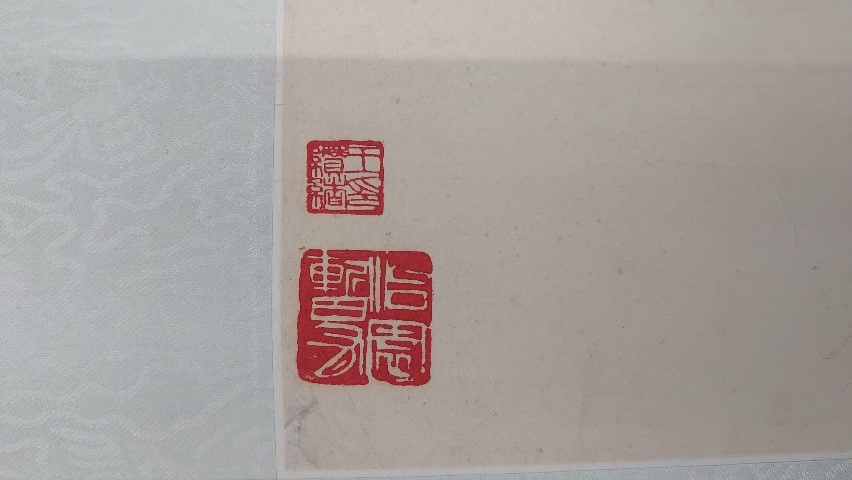 該畫由顏昌德於1964年的北京收藏之旅中從榮寶齋直接購買,並於隔年運抵博物館。[15] 根據《仕女》上的題詞,這幅畫是張大千贈給國民黨川軍將領王纘緒(1886-1960)的禮物。該畫左下角可見兩枚藏家印:「王纘緒印」與「治園暫有」(王纘緒宅邸名治園);後者應由曾跟王纘緒交情甚篤的齊白石所刻 【圖六】。[16] 《仕女》畫軸一處可見略為破損的「文物商店」寄售標籤【圖七】。