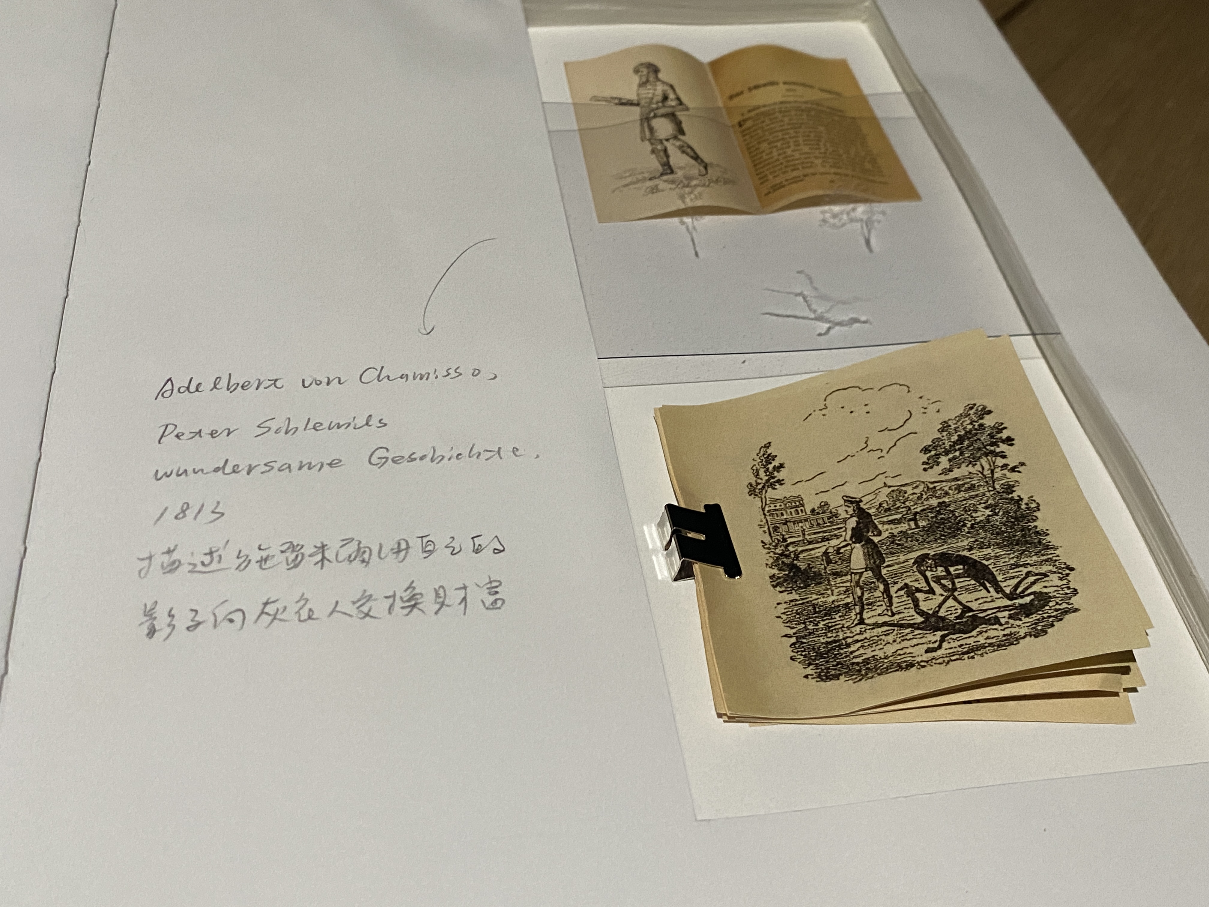 張紋瑄的《南勢庄故事集》【圖3】【圖4】,以手工書的形式,書寫了身為庄頭廟乩童的親人,被靈體上身後訴說的鄉野奇談。除了故事本身的描寫,藝術家更親手以現成物與剪貼的資料,製作成立體的「索引」,將台灣的乩童文化與其他地區的薩滿文化相聯繫。書籍被布置於展場四處,巧妙的串聯起展覽中其他的作品。《南勢庄故事集》並不訴諸巨大的影像展示,或是如檔案櫃般羅列的史料呈現,它邀請觀眾坐下來閱讀一段段的故事,「鬼神」的形象也因此掙脫了特定文化符碼的框限,從文字中開啟更多元的想像。簡.金.凱森(Jane Jin Kaisen)的作品《離別社群》則透過朝鮮民間神話的鉢裡公主傳說為主軸,觸及朝鮮地區殖民與戰爭歷史背後,小人物的集體傷痛記憶,並透過薩滿儀式重新療癒。