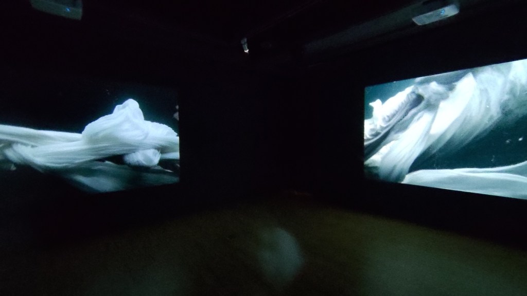 而2023年至2024年的「生/活在一起-第八屆台灣國際錄像藝術展」儘管並非以「鬼神」為策展主題,在展覽中亦可見到些許作品觸及民俗儀式或是自然力量,其簡練鬆弛的視覺,緩慢地節奏、以及相對單純的形式,或許可視為前述轉向的延續。西蒙・普勞夫(Simon Plouffe)的作品《森林們》,以沉於水底的樹根,開啟植物之間萬物皆有靈的對話的想像,並隱然暗示著現代化建設對自然地景的改變。而簡.金.凱森(Jane Jin Kaisen)的影像作品《獻祭—盤繞擁抱》【圖五】,以濟州島地區海女文化及其傳統信仰為主題,以祭典儀式的動作帶動白色布幔在水中緩滿的舞動,牽連起海洋與海女之間的生命關係,且隱隱指向當今環境改變的種種課題。