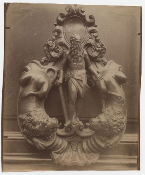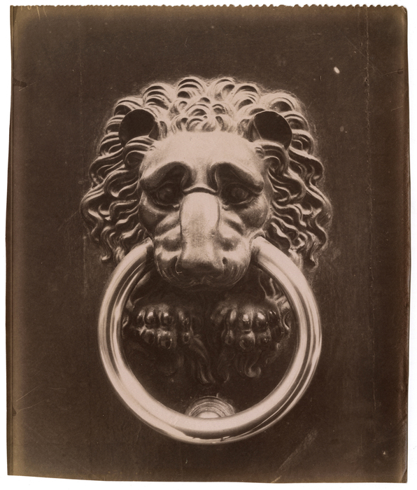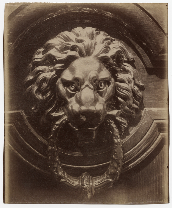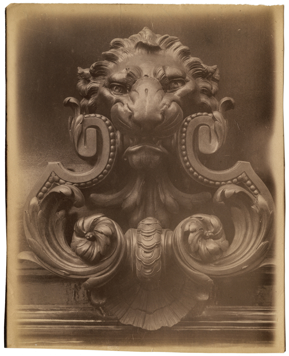 除了神話故事中的神祇或英雄人物,動物也經常出現在門環設計上,特別是雄獅。在《波旁巴士宅邸,格雷內爾街118號》(Hôtel de Bourbon Busset, 118 rue de Grenelle, 1898)【圖5】,照片中清晰可見門環的底座是一隻威風凜凜的獅子。從其蓬鬆茂密的鬃毛、炯炯有神的眼睛和臉部清晰的肌肉輪廓,都具體展現眼前這頭獅子的神韻與霸氣。此外,這件作品中強烈的光影對比,讓目光聚焦於底座的獅頭,增添整體畫面中的戲劇性。另一件《拉瓦帕利耶爾宅邸,今熱拉爾男爵,聖奧諾雷85號法布爾格》(Hôtel de La Vaupalière, Aujourd’hui Baron Gérard, Faubourg Saint-Honoré 85, 1901)【圖6】的獅子造型就相當不同,這件融合植物花卉的圖騰與底部貝殼的立體裝飾,最上方的獅頭口中含著環狀握把,露出猛獸的獠牙,以居高臨下的眼神傲視前方。不過,獅子口中含著的巨大門環,像是馴獸的工具,因而減弱畫面中猛獸帶來的威脅性。這張照片的拍攝距離非常近,以至於畫面左右兩側的門環都被外框所裁切,整張照片顯得較為擁擠。拍攝時間稍晚的《門環,瓦倫街20號》(Heurtoir, 20 rue de Varenne, 1911)【圖7】則呈現另一種樣貌的獅子,這件做工精緻的雄獅可能是參考希臘雕像的設計元素:捲曲的毛髮、高挺的鼻骨、深邃的眼窩。這張照片的光影對比相當強烈,光線投射在獅子所咬住的環形門把上,看起來光滑無瑕,顯現這件門環在製作時,工匠應該花費相當多時間打磨成品,才能讓金屬表面閃閃發光。由於這隻獅子的臉型設計上,在眼睛上比例稍大而顯得楚楚可憐,也因此少了點威脅感。透過上述三件同為雄獅設計的門環攝影,我們可以發現在視覺上有相當大的落差。無論是設計風格上的差異,或是照片中光影變化的不同,每個門環上的獅子都呈現個性化的樣貌,好像透過這些照片可以排列出雄獅喜怒哀樂的表情。