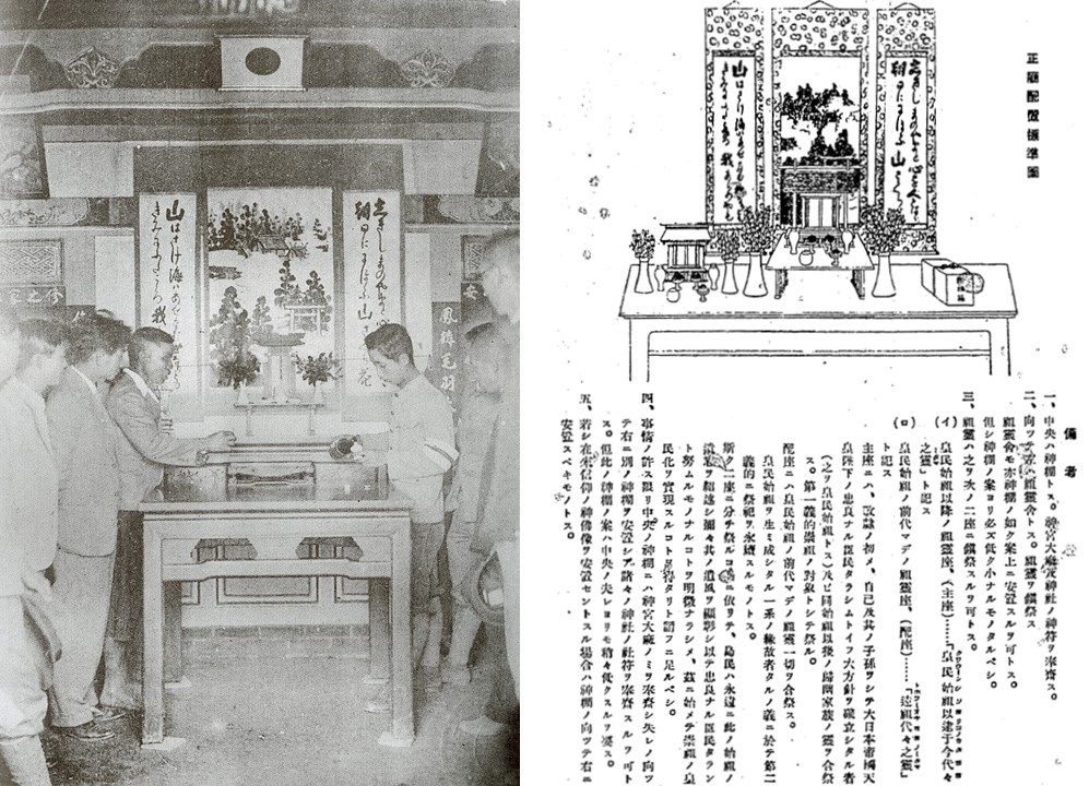 進一步強化推論的證據是,描繪伊勢神宮皇大神宮的畫軸,時常被用於正廳改善上。觀察當時正廳改善的示意圖【圖10】,與實際擺設的照片【圖11】,可以看到掛畫伊勢神宮的構圖,與國美館藏〈臺灣神社〉十分接近,都是雲霧繚繞的杉林搭配鳥居與神宮[5]。類似的構圖出現在許多以伊勢神宮為題材的畫作,可以視為固定的圖式。