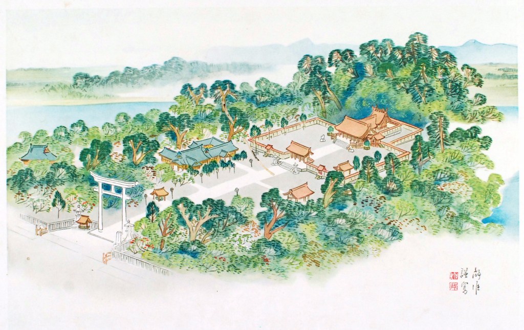若仔細比對,雖然外觀有些許不同,但畫中的神明造神社,無論是千木或是鰹木的形制,都更接近伊勢神宮,而非臺灣神社。如此猜測,也對應前面關於林相的討論。