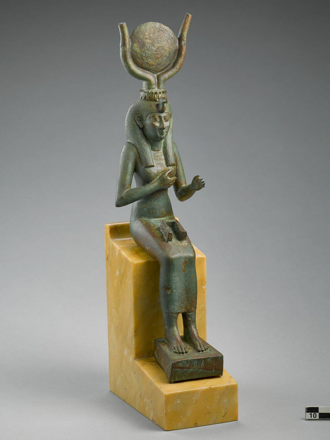 女祭司腳下的月亮以及頭冠是另一個有趣的引用,偉特牌女祭司頭冠的樣式在過去的塔羅牌不曾出現,而非常相似於古埃及雕塑中時常出現的日冠【圖11】,圖像上日月的引用可能指涉了啟示錄中的女子:天上現出大異象來:有一個婦人身披日頭,腳踏月亮,頭戴十二星的冠冕。(啟示錄12:1)