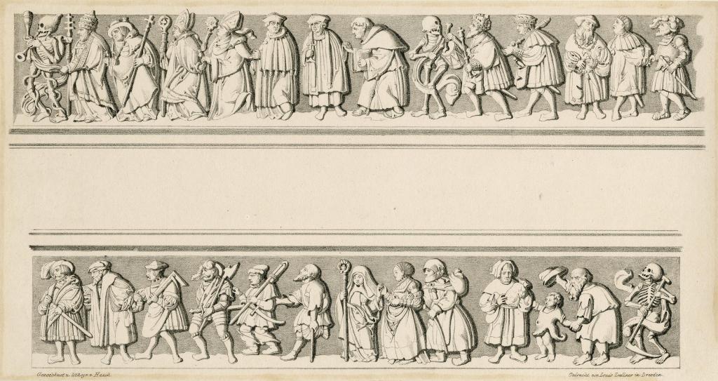 將骷髏與不同階級的人物並置的圖像,則來自中世紀至文藝復興以來的圖像-文學傳統死亡之舞(danse macabre)【圖4】,其寓意就是無論生前地位如何,人終將難逃一死,在相關的圖像中,死者看起來會比活人更加的有活力,活人幾乎是不情願地被拖著起舞。