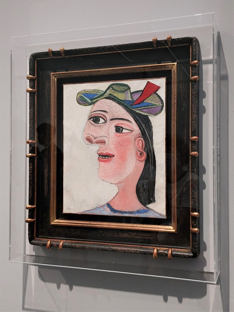 畢卡索(Pablo Picasso, 1881-1973)作為本次展覽最受矚目的藝術家之一,觀眾自然不會錯過他膾炙人口的作品《哭泣的女人》(Weeping Woman, 1937)【圖1】,以及《一個女人的半身像》(Buste de Femme, 1938)【圖2】。這兩件作品被視為畢卡索肖像畫的經典,同時也牽繫著藝術家豐富的感情生活,而《哭泣的女人》更被視為對戰爭苦難的幽微指控。[1] 從這兩件作品中,可以看到女人的臉被線條與色塊分割、面部的輪廓產生變形,甚至與擦拭的手帕融為一體。這樣的繪畫手法,似乎與當時興盛的超現實主義(Surrealism)中,荒誕形變的圖像有異曲同工之妙,畢卡索也曾參與超現實主義相關的活動,並且與超現實主義詩人紀堯姆.阿波里奈爾(Guillaume Apollinaire, 1880-1918)關係緊密,[2] 不難推斷作品受到超現實主義的影響。然而,若細究這兩件作品的形式,便會發現分割的色塊、被同時並置的左右臉,以及清晰的線條劃分,更隱含著立體主義繪畫的影子。立體主義作為畢卡索創作重要的核心之一,孕育出他往後鮮明且獨樹一幟的風格,而立體主義的誕生與流變,除了與攝影術的發明有間接的關聯性,同時也與大眾文化有所牽連。
