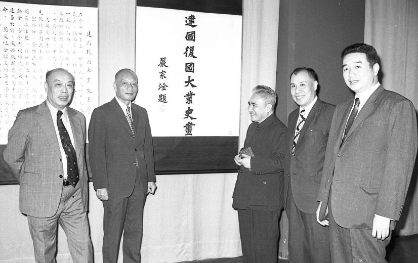 在史學家、書法家、畫家之外,展覽中也有著政要的身影。在開展前的預展,國父紀念館處長施俊文與幾位政要們,包含書寫第二主題序的國民黨中央常務委員鄭彥棻(1902-1990),與第三主題序的總統府戰略顧問黃杰(1902-1995),一同在總統嚴家淦(1905-1993)所題「建國復國大業史畫」前留下合影,是為政要參展的歷史紀錄【圖2】。[6] 終於,歷時半年的籌劃,展覽在1975年10月30日,也就是蔣中正誕辰的前一日正式開展。首波展出「國父與國民革命」、「國父與總統蔣公」主題。[7] 「總統蔣公與國民革命」、「青年與國家」主題則於12月25日加入。[8]