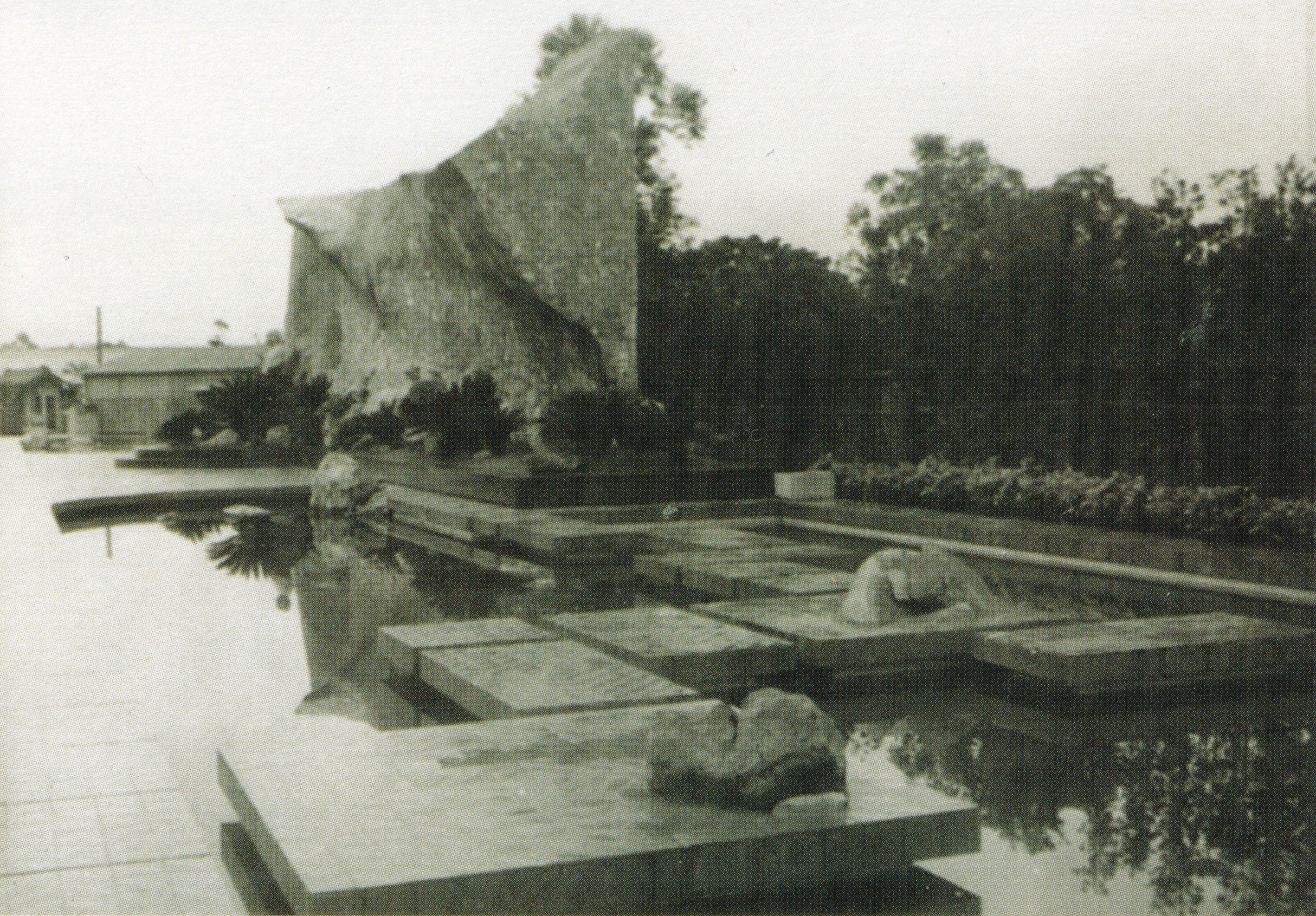 誠如上述,1967年藝術家以花蓮盛產的大理石,完成宮殿風的梨山賓館前石雕群設置案。此案中,除了低伏造型的《開發》之外,亦見「近山形石」的尖銳三角形山石。此時,藝術家設計水池流水,完成東方傳統庭園造景的「一池三山」,從而得以對應梨山賓館的東方古典宮殿風格。