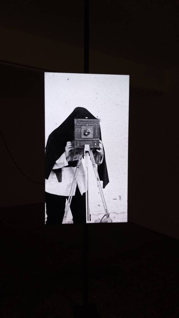 展場中首先看到作品《攝相機(65)》(2024)【圖1】,錄像中的人拿著一台舊式的照相機對觀者拍攝肖像照,場景源自於十九世紀時期殖民者以攝影作為對華人苦力的監控,被拍攝的苦力成為檔案的一部分,作為一種即將被輸出的勞力商品,同時也作為防止犯罪或叛逃的身分紀錄。