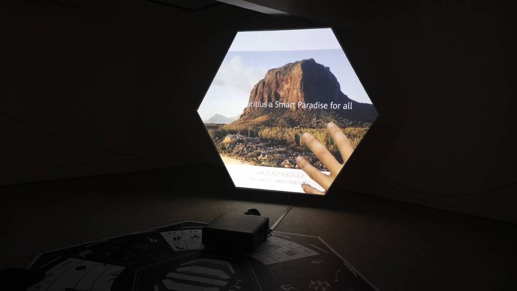 將象徵過去的《攝像機(65)》與象徵未來的《智慧城》連結起來的是《鏈結》(2024)【圖3】,作品紀錄過去十九世紀模里西斯作為華人苦力中繼站,到當今中國跨國企業通過海底電纜建立的世界大腦藍圖。呈現模里西斯首都的華人會館「南順世襲大廈」,此地混合商業、辦公、居住,並做為移民的支持、照護及物質與資訊交流之所在[4]。