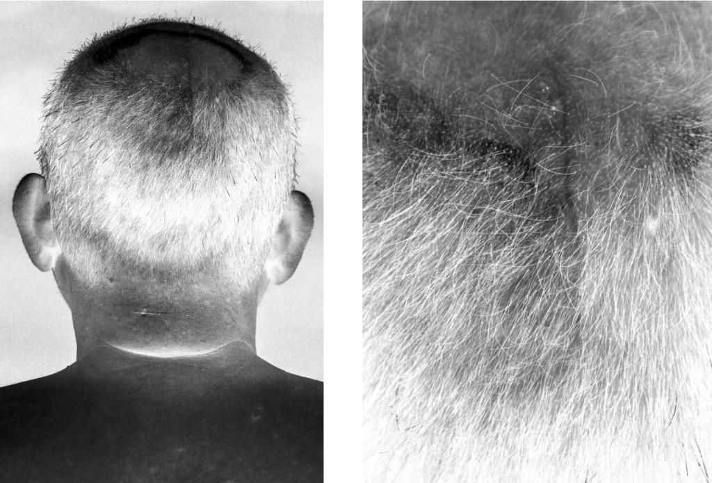 從發展成熟的攝影術到今日數位化的攝影,雖然負片底片沖印與放大的過程不再必要,負片也轉而成為一種影像特效,喪失190年前光線落在實物上形成負像時與實物直接的接觸感。黃榆惠的《工.70》選擇使用負片的數位特效拍攝父親的肖像,影像不見主角的面容而是直視其後腦勺,頭頂有幾道深色的痕跡似乎是突起的疤痕,藏匿在髮根裡,原本的黑色髮絲轉白,而真正的白髮則如同黑色的細針,鮮明地從受光處襯托出來,使得中年的父親,透過負片的拍攝,在影像中被描繪為70歲的白髮樣貌。順著頭髮往下到頸部,皮膚一道實際上深深向內的摺痕發亮著,照見上方另一道反白的傷痕,結痂的部分則變成有如刻痕的深色疤痕【圖1】。接著,從頸部到肩部的皮膚隨著陰影逐漸變深,卻未掩蓋頸部以及皮膚曝曬過度到處突起的疙瘩。透過負片,在認知的現實與影像之間,我們必須顛倒黑白深淺的色調,重新去觀察與解讀這幅工人肖像。黃榆惠在《工.70》的自述裡引用了2017年林立青所出版《做工的人》,內容談及焊工師傅的壽命多半落在70歲,以此警醒自己去關照身為焊工的父親,[5] 她打散了不同的身體部位,有頭頂的疤痕、耳朵、臉頰、手掌、以及體毛中的疤痕,讓黑白鮮明的皮膚肌理、被放大的毛細孔紋路、交錯縱橫的體毛,皆透過負片強烈的對比刻劃出父親的身體紋路。