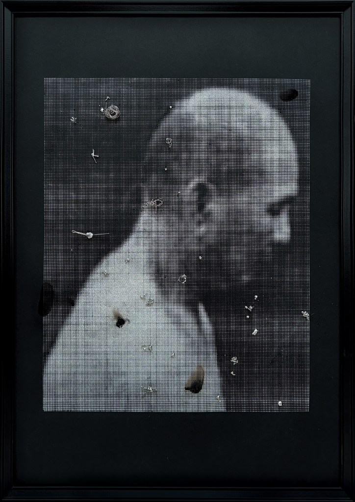然而,黃榆惠並未放棄拍攝者與被拍攝者,屬於人與人之間的關懷,修補如此冷冽陌然甚至像是醫療X光的影像。黃榆惠的《工.傷》則透過絹印重建光線曝曬的過程,再次轉印《工.70》的負片影像,將父親的身體看作是建築體,使用焊錫與鋼絲的材料直接在影像上修補與接合他身上曾經撕裂、受損的部位,以金屬材料嫁接脆弱的肉身。有時,背景猶如沾染體液的白色紗布,當焊錫材料超出了身體的部分,也成為接合與補強作品的外部材料【圖3】。另一張《工.傷》則是再次反轉負片獲得正片影像,相較於另一張負片影像的強烈對比,正片影像在黑色背景中還原出接近現實情況的側面肖像,皮膚的質感不再,轉而是模糊的身影,銀色的焊錫與鋼絲反過來融入淺色的皮膚影像裡,或者,在黑色的背景中,鑽出孔洞、拉扯出纏繞或糾結的鋼絲,以破壞影像自身的方式,讓材料被突顯出來【圖4】。