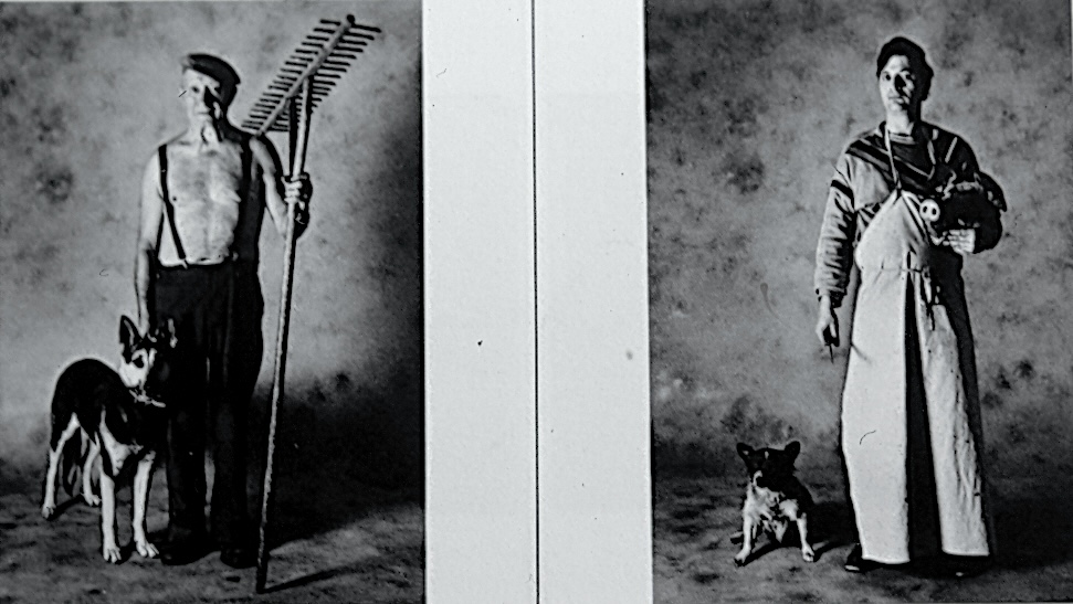 像加里柏(Patrick Galibert)【圖2】有一組人物肖像系列作便是既有模仿的成份也包括謔仿式的局部變形(imitation parodique)。若論其藍本,至少可看出兩種,一是桑德(August Sander, 1876-1964)的《時代的面孔》(Face of Our Time, 1929),一是潘恩(Irving Penn, 1917-2009)的《小房間裡的世界》(Worlds in a Small Room, 1974),這兩位攝影界前輩之作皆屬紀實性系列作。換言之,加里柏的藍本非單一照片,而是一組一組的肖像類型。從兩者沿襲來的是主題(指稱物組合),即各行各業人士帶有職業標記物(工作服、工具配件)的正面立身肖像,並仿造了潘恩帶有斑影的灰色調中性背景布幕(常見於十九世紀相館的裝備)。這是模仿的部份。至於變形,是在每幅肖像的故事空間裡加了個細節,也就是在「前拍照時刻」,在人物身旁添加了一個被拍對象,即後來的影像中多了一項指稱物。換言之,每位專業代表的身邊「一律」伴著一條狗──新時代人的面孔好像須要加上伴隨的家犬來定義身份:照片裡,與主人一般道貌岸然的狗好像也成了界定主人社會身份的一項要件了?!