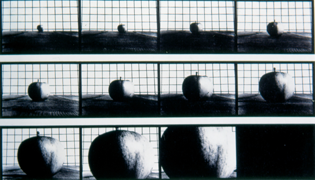 變形模仿之作往往嘲諷意味明顯,解讀過程須要靠攝影史的常識。佛蘭東(Hollis Frampton, 1936-1984)與法雷(Marion Faller, 1941-2014)的作品【圖3】便是影射謬布里吉(Eadweard Muybridge, 1830-1904) Animal Locomotion(1887)十九世紀末的科學實驗。步驟是先模仿動機(研究動物連續動作的瞬間差異變化)以及紀錄動作的連續分格形式,再改變其中的主角:這件作品很有趣的,不是對活生生動物的觀察實驗,而是表現一只蘋果正從遠景處,一格一格,往前景處挪移前進!靜物怎會前進?當然是有如某些動畫片,讓東西的位置在每格之間動了手腳:以此來諷刺與質疑攝影科學紀錄在客觀真實性方面的不可靠。