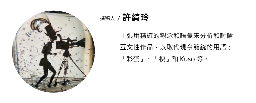 這一類互文關係的傳統攝影或底片機為主的作品,其(同為攝影媒材的)模本、前作或藍本之實體已遭到變造、破壞或轉型,就本相而言可能被隱沒、遮蔽而不在場(absent),只經由後承文本或終致作品來喚起源頭的聯想。其中某些特色已由一方轉移、殘留或變相出現於另一方,經過這樣的模仿和變形從而建立屬於後承文本性或者衍生文本性(hypertextualité)的互文關係。從這類作品中揣摩其建構過程,特別令人留意到的是時間上的一先/一後時序性,而在空間實際占有的位置,是一在場/一不在場,前依之模本僅能以心智之像(image mentale)的形式存在,繼續發揮它在後承文本中的語義效用。