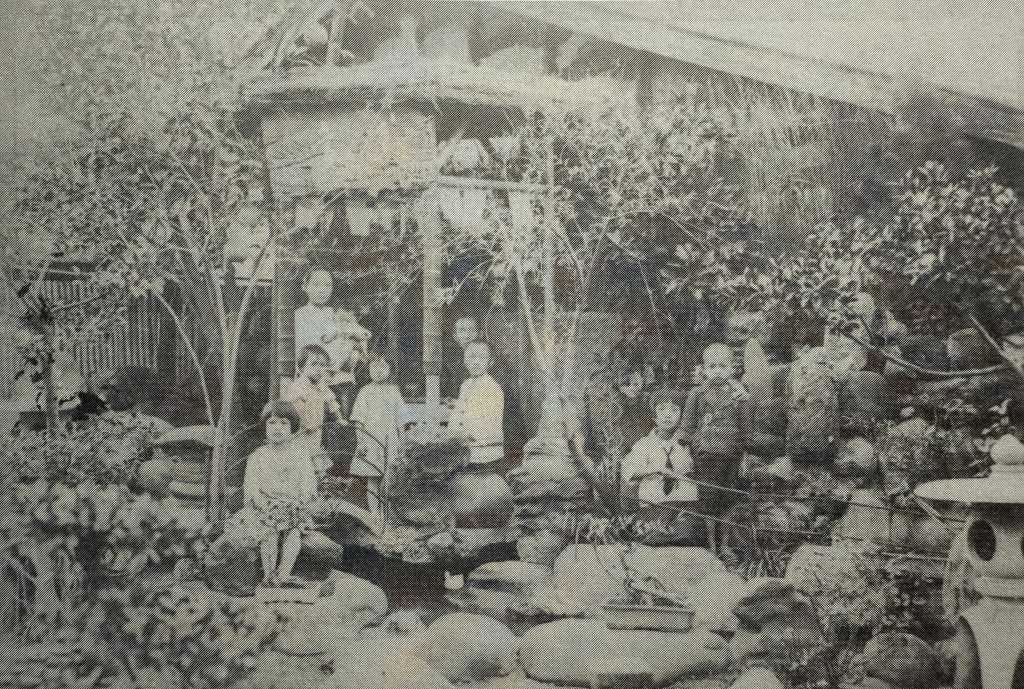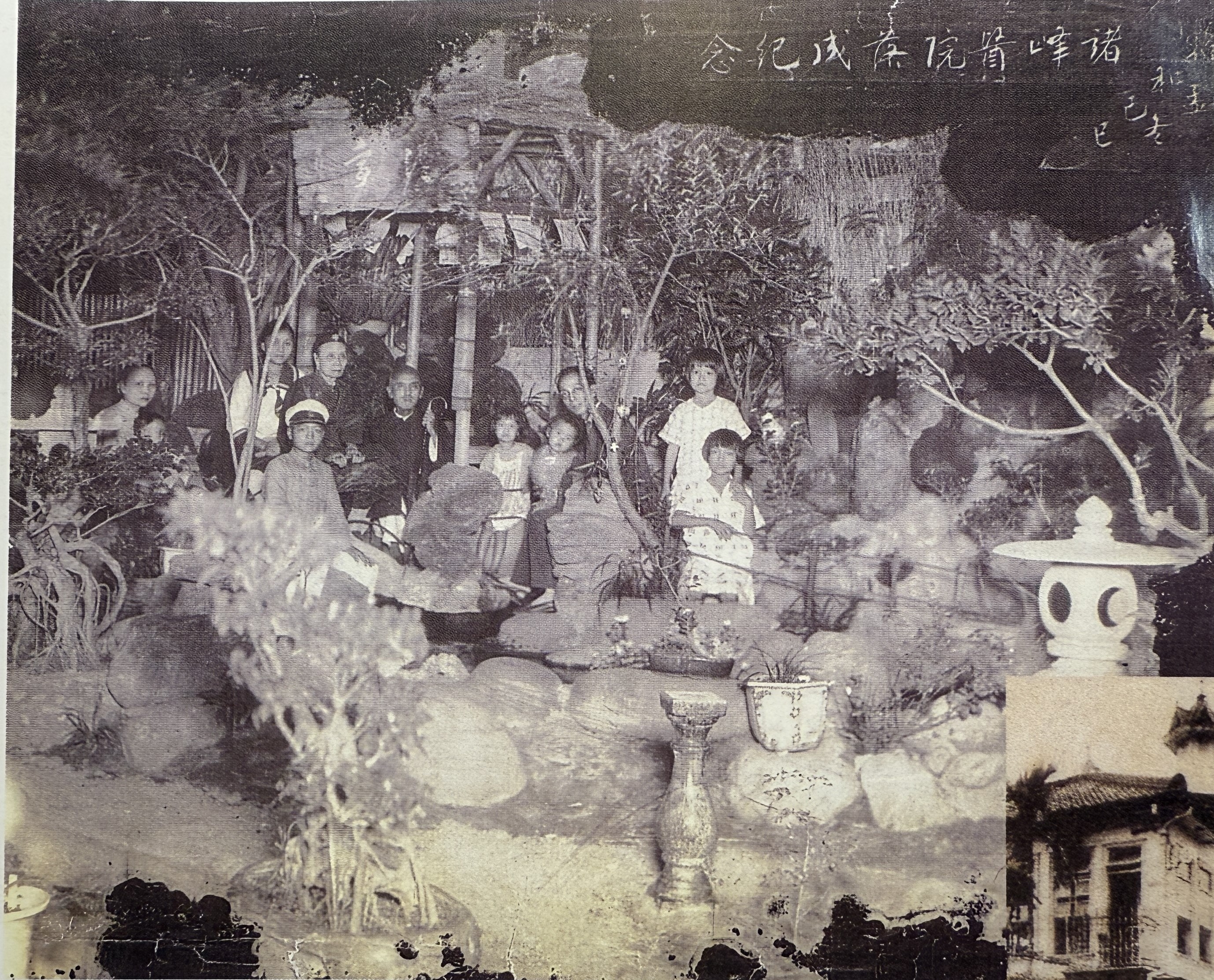 這座佈置有涼亭、水池、奇石與花木的中式庭園,附屬於諸峰醫院,是張氏夫婦1929年改建洋樓之初即設計的一部分。當年10月,全家於逸園合影留下兩張黑白照片,清晰記錄了園林初始風貌。【圖1、2】亭中高懸草書「澹亭」二字木匾,亭柱裝飾以竹製對聯,字跡雖模糊,但足見當時營造之用心。從其他照片可見,亭內設有圓形石桌,亭前小橋橫跨一方名為「沁池」的水池,構成幽雅靜謐的視覺焦點。